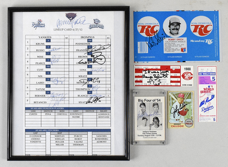 Description:Lot of assorted baseball autographs including some stars and better names (EX-NM). Incl. 2012 Lehigh Valley IronPigs vs Scranton/Wilkes-Barre Yankees lineup sheet signed by (14): Ryne Sandberg, Dellin Betances, Domonic Brown, Steve Pearce, Kevin Frandsen, Kevin Russo, Hector Luna, Brandon Laird, Rick Thompson, Andres Blanco, Doug Bernier, Cody Overbeck, Derrick Mitchell, Austin Hyatt (framed); Promotional card dual-signed by Bob Feller & Mike Garcia; c. late 1960s whiffle ball box signed by Tim McCarver; 1968 Topps #415 signed by Johnny Callison; 1988 Reds ticket signed by Marge Schott; 7.5"x14.5" framed Cory Lidle display containing a signed Phan Fest print; Souvenir glass signed by Bobby Shantz; 1977 RC Cola can signed by Bob Grich (still in flat form); 1977 "Talking Outfielding" cassette tapes signed on the cover by Joe Rudi; 1981 World Series Game 5 ticket stub signed by Bill Russell; 1984 Mets program signed by Davey Johnson; (4) signed 8"x10" photos: Bob Friend (framed), Elroy Face (framed, personalized), Jack Fisher, Armando Galarraga (framed); 2004 publication photo signed by Mike Lowell (framed); "Infield Play" VHS tape signed by Bob Grich; (4) signed team issue photo cards: Tom Herr, Tommy Greene, Freddy Sanchez, Kris Benson; 1984 Donruss card signed by Larry Parrish; 4"x5.5" photo signed by Chris Coste; (4) signed index cards: Dave Kingman, Chili Davis, Dan Gladden, Clint Hurdle; Golf ball signed by Rick Rhoden; Indians 1993 Winterfest ticket signed by R.E. Jacobs. Sigs rate 8 to 10 out of 10: EX-NM