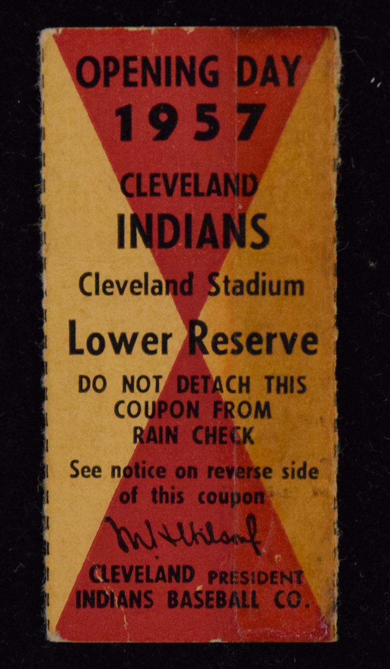 Description:4/16/1957 Roger Maris debut ticket stub (see description). Cleveland Indians opening day ticket stub from game against the Chicago White Sox which was won by the White Sox 3-2 in 11-innings with Billy Pierce and Herb Score both pitching complete games. Roger Maris made his MLB debut in the game, going 3-5 with a run scored. The ticket stub is the smaller portion detached from the rain check portion, and has tape residue on the right edge.