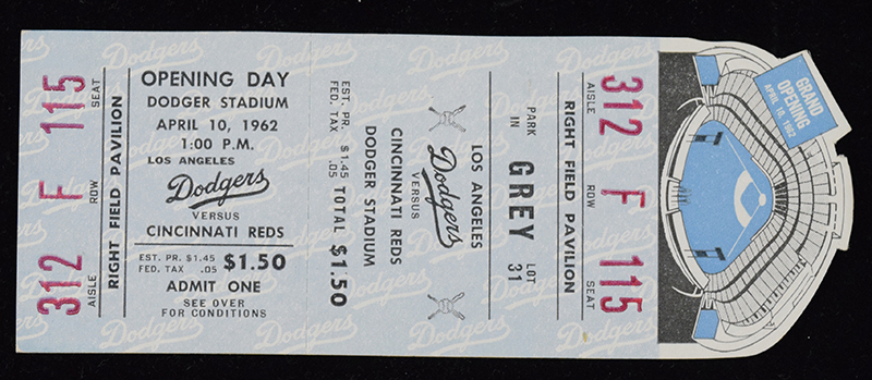 Description:4/10/1962 Dodger Stadium grand opening full ticket (EX/MT-NM). Los Angeles Dodgers opening day full ticket for game against the Cincinnati Reds which was the first game at Dodger Stadium. Only very minor corner wear, with clean front and back: EX/MT-NM