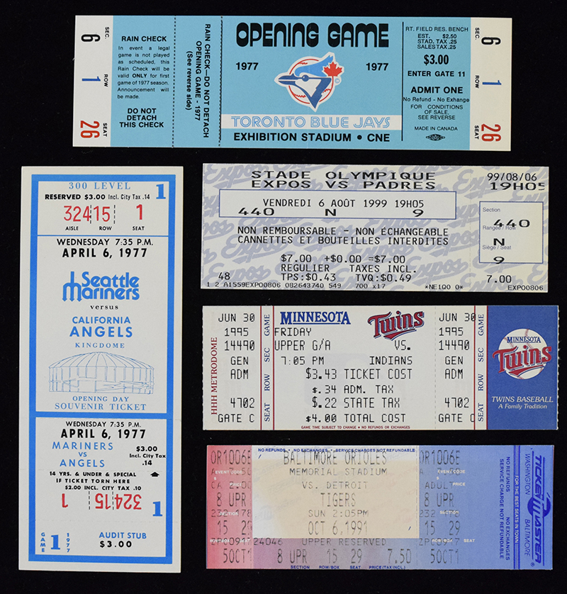 Description:Lot of (11) MLB tickets from 1971-1999 including historic games (EX-NM/MT). Includes 4/10/1971 Montreal Expos at Philadelphia Phillies ticket stub (first game at Veterans Stadium), 4/6/1977 California Angels at Seattle Mariners full ticket (first game in Mariners history), 4/7/1977 Chicago White Sox at Toronto Blue Jays full ticket (first game in Blue Jays history), Unused 1982 New York Yankees season ticket (corner wear), 5/11/1988 New York Mets at Houston Astros full ticket, 8/15/1990 San Francisco Giants at Phillies full ticket (Terry Mulholland no-hitter), 10/6/1991 Detroit Tigers at Baltimore Orioles full ticket (last game at Memorial Stadium), 6/30/1995 Cleveland Indians at Minnesota Twins full ticket (Eddie Murray 3000th hit), 9/20/1998 St. Louis Cardinals at Milwaukee Brewers full ticket (Mark McGwire 65th HR of season and 452 of career), 4/23/1999 Cardinals at Los Angeles Dodgers full ticket (Fernando Tatis only player to hit 2 grand slams in one inning), and 8/6/1999 San Diego Padres at Expos full ticket (Tony Gwynn 3000th hit): EX-NM/MT