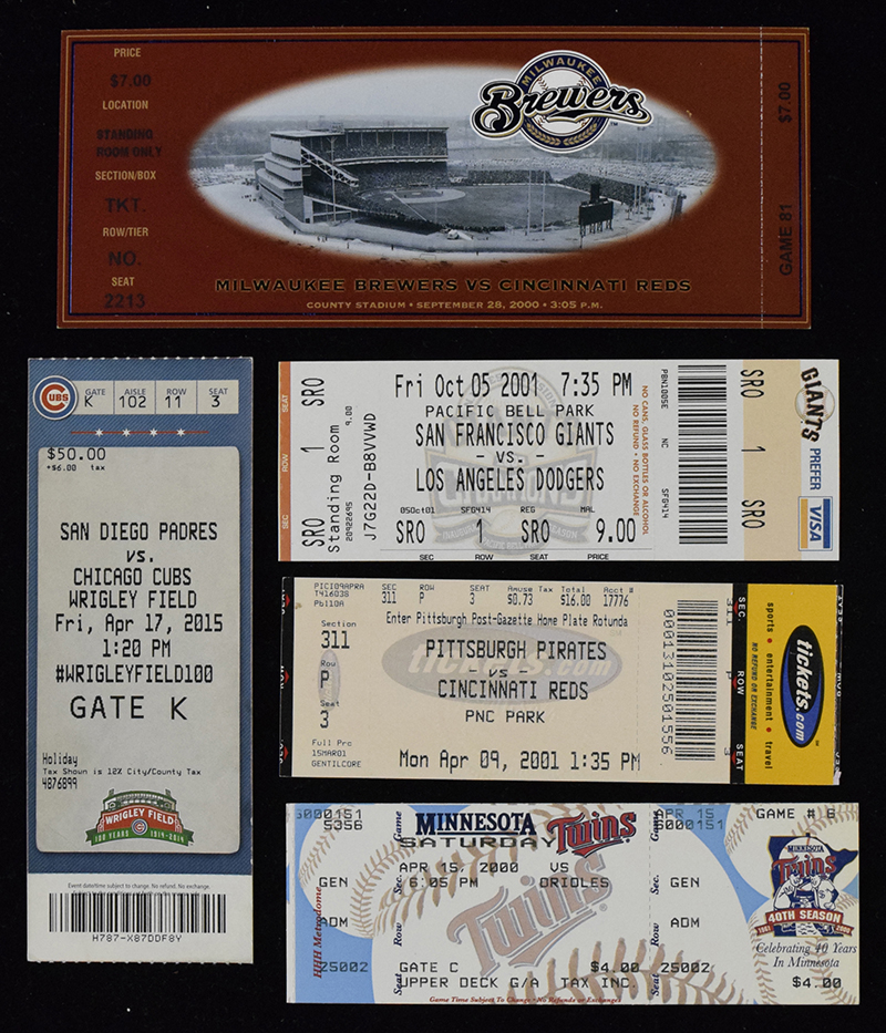 Description:Lot of (11) MLB tickets from 2000-2015 including historic games (NM-NM/MT). Includes 4/15/2000 Baltimore Orioles at Minnesota Twins full ticket (Cal Ripken Jr 3000th hit), 9/28/2000 Cincinnati Reds at Milwaukee Brewers full ticket (last game at Milwaukee County Stadium), 4/9/2001 Reds at Pittsburgh Pirates full ticket (first game at PNC Park), 10/5/2001 Los Angeles Dodgers at San Francisco Giants full ticket (Barry Bonds record breaking 71st and 72nd HRs of season), 4/4/2003 Chicago Cubs at Reds full ticket (Sammy Soa 500th HR), 4/27/2003 Giants at Philadelphia Phillies full ticket (Kevin Millwood no-hitter), (2) 2003 NLCS Game 6 ticket stubs (Bartman game), 4/3/2004 Cleveland Indians at Phillies full ticket (On Deck Series game which was 1st game played at Citizens Bank Park), 6/11/2013 Giants at Pirates full ticket (Gerrit Cole MLB debut and 1st win), 4/17/2015 San Diego Padres at Cubs full ticket (Kris Bryant MLB debut): NM-NM/MT