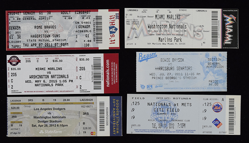 Description:Lot of (6) Bryce Harper significant game tickets (NM-NM/MT). Includes 4/7/2011 Hagerstown Suns at Rome Braves full ticket (first professional game), 7/27/2011 Harrisburg Senators at Bowie Baysox ticket stub (first AA home run), 4/28/2012 Washington Nationals at Los Angeles Dodgers full ticket (MLB debut), 8/29/2012 Nationals at Miami Marlins full ticket (first multi-HR game), 9/11/2012 Nationals at New York Mets full ticket (first 4-hit game), and 5/6/2015 Marlins at Nationals full ticket (3-HR game): NM-NM/MT