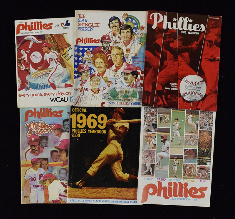 Description:1971 Veterans Stadium opening game program, plus (9) Philadelphia Phillies yearbooks from 1964-1978 (FR/GD-NM). Yearbooks include 1964 third edition (writing on cover), 1965 second edition, 1967 (VG), 1968, 1969, 1970, 1975, 1976, and 1978 (FR/GD-NM, avg VG/EX overall). Also includes 4/10/1971 Montreal Expos at Phillies program which was the first game at Veterans Stadium (EX/MT-NM unscored).