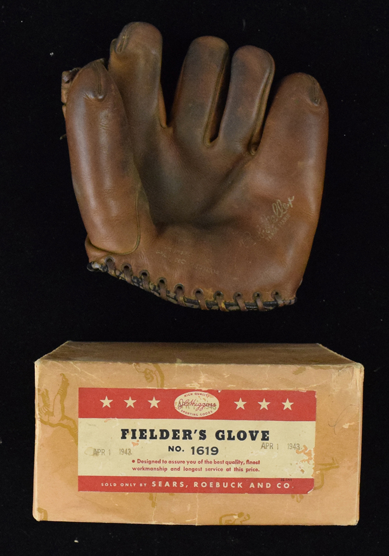 Description:1943 Bob Feller store model baseball glove with original box (VG). J.C. Higgins 1619 Bob Feller model glove for right handed thrower (VG, used, light writing on wrist strap). Comes with original box which is stamped April 1st 1943 (box VG/EX).