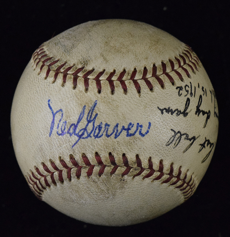 Description:Ned Garver signed 1952 baseball attributed to Garver win (VG/EX). W.Harridge AL ball signed by Garver in blue ink rating 8 out of 10 (modern autograph). Garver wrote on the side panel in the period: "This is the last ball used in opening day game in Detroit" "April 15, 1952" "3-0". Expected surface wear from use: VG/EX