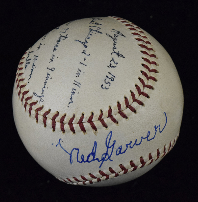 Description:Ned Garver signed 1952 baseball attributed to Garver win (EX/MT). W.Harridge AL ball signed by Garver in blue ink rating 8 out of 10 (modern autograph). Garver wrote on the side panel in the period: "August 23, 1953" "Beat Chicago 2-1 in 11 inn." "threw 77 times in 9 innings" "100 times in 11 inn." "32 were balls". Only minor wear: EX/MT