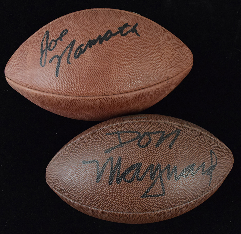 Description:Joe Namath and Don Maynard signed footballs (EX/MT-NM). Includes a P.Tagliabue NFL football signed by Joe Namath (Online Authentics and Steiner stickers, no COA); and Wilson NFL Super Grip football signed by Don Maynard. Signatures rate 9 to 9/10 out of 10. Namath ball does not quite fully inflate: EX/MT-NM