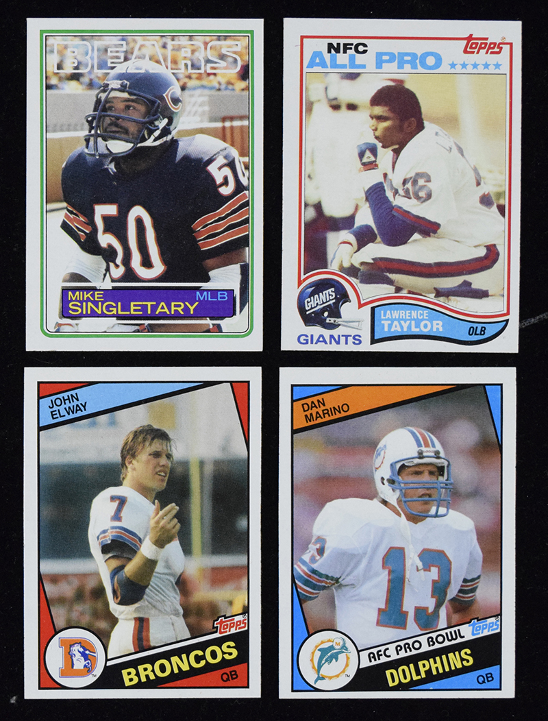 Lot of (32) Football HOFers rookie cards from 1982-1996 (NM-NM/MT overall).Includes 1982 Topps # 434 Lawrence Taylor; 1983 Topps #38 Mike Singletary; (2) 1984 Topps #s 63 John Elway; 1984 Topps #s 111 Howie Long, 123 Dan Marino, and 280 Eric Dickerson; 1986 Topps #s 161 Jerry Rice and 388 Andre Reed; 1989 Topps Traded #83T Barry Sanders; 1990 Pro Set #685 Emmitt Smith; 1991 Score #611 Brett Favre; 1994 Topps #445 Marshall Faulk; 1994 Topps Stadium Club #327 Faulk; 1994 Classic NFL Draft "Promos" #PR1 Faulk; (2) 1994 Fleer Flair "Wave of the Future" #2 Faulk; 1994 Fleer Ultra #408 Faulk; 1994 Pinnacle #198 Faulk; 1994 SkyBox Impact #274 Faulk; (2) 1994 Upper Deck #7 Faulk; 1994 Upper Deck Collector's Choice #14 Faulk; 1994 Upper Deck Collector's Choice "Crash The Game Green Foil" #C11 Faulk; 1994 Upper Deck SP #3 Faulk; 1995 Select Certified #117 Curtis Martin; 1995 SkyBox Impact #179 Warren Sapp; 1995 SkyBox Impact "Rookie Running Backs" #8 Martin; 1995 Upper Deck #12 Sapp; 1995 Upper Deck Collector's Choice #12 Sapp; 1995 Upper Deck SP Championship #29 Martin; and 1996 Upper Deck Collector's Choice Update #U59 Terrell Owens. Most cards appear to average NM-NM/MT overall, with any issues mainly due to centering rather than structural wear.