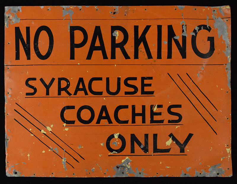 Description:Syracuse coaches parking sign attributed to Archbold Stadium (VG).Approx. 24"x32" metal orange sign stating "NO PARKING" "SYRACUSE COACHES ONLY" in black. Fairly heavy wear, with areas of surface loss and some bending to the metal: VG