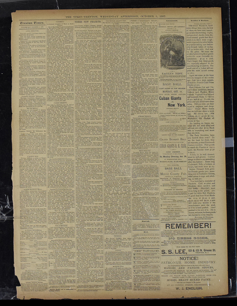 Description:1887 page from the Trenton Times newspaper with Cuban Giants vs. New York headline (VG/EX).Full page from the October 5th 1887 edition with a headline announcing the the last game of the season (an exhibition game between the New York Giants and Cuban Giants) to be played on October 10, with Tim Keefe (misspelled Keife) and Buck Ewing listed as the battery. Scattered corner/edge chips: VG/EX