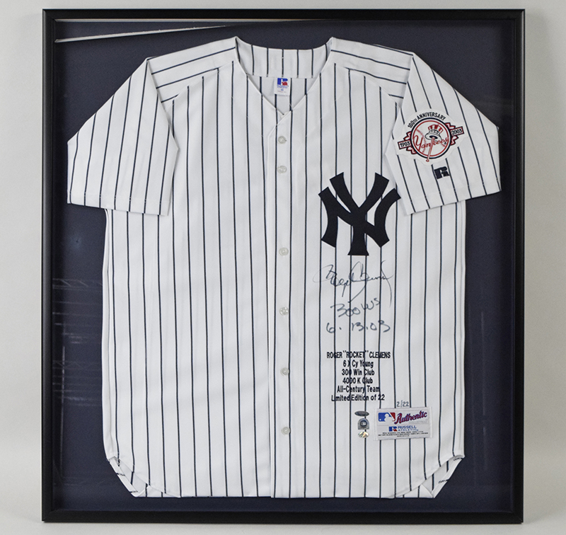 Description:Roger Clemens signed & inscribed limited edition framed New York Yankees jersey - Tri-Star & MLB Authenticated (NM).32"x34" framed Russell Athletic size 48 Yankees jersey with 2003 Yankees 100th Anniversary patch and embroidered with career accomplishments. Clemens signed the jersey in black marker and added "300 Ws 6-13-03" inscription. Signature rates 8 out of 10. Tri-Star and MLB Authenticated serial #ed hologram stickers are affixed. The jersey is #ed 2/22. Due to framing, complete condition is unknown: NM appearance (top edge of interior matting is partially detached)