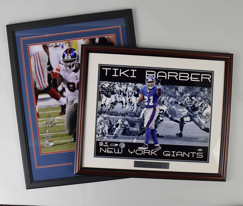 Description:Lot of New York Giants memorabilia and autographs (NM overall).Autographs include 22.5"x26.5" framed photo signed by Tiki Barber rating 8 out of 10 (Steiner), and 22.5"x29.5" framed photo signed by Jason Pierre-Paul rating 9/10 out of 10. Also includes 12.5"x15.5" framed 2000 New York Giants NFC Champions display by Highland Mint (#ed 29/2000, coin is sitting off-center); 13"x16" framed Super Bowl XLII display by Highland Mint (#ed 920/2500); and Wilson official NFL Super Bowl XLII football: NM overall
