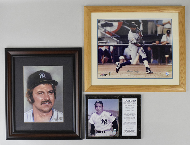 Description:Lot of New York Yankees autographs and display pieces (NM-NM/MT).Autographs include 12"x15" plaque containing a photo signed by Yogi Berra rating 6/7 out of 10, and 23.5"x27" framed photo signed by Alfonso Soriano rating 8/9 out of 10. Also includes 20.5"x24.5" framed Thurman Munson print by Hai Yan; and 14"x18" framed Derek Jeter 3000th Hit display. Due to framing, complete conditions are unknown: NM-NM/MT appearance