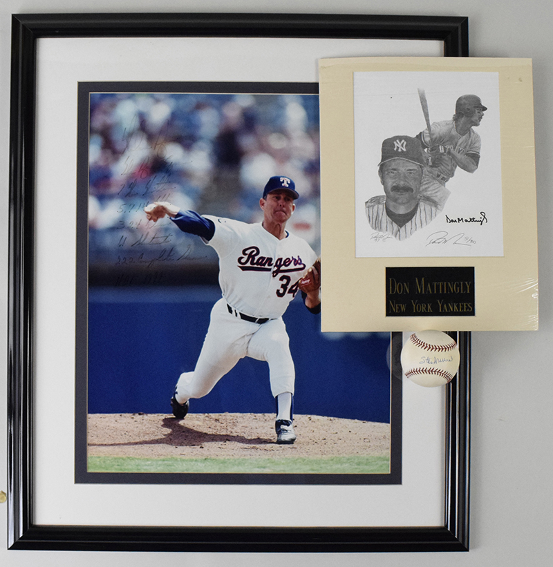 Description:Baseball stars and HOFers autograph lot (EX-NM/MT).Includes L.Coleman NL ball (light toning) signed by Stan Musial (UDA); L.Coleman NL ball (toning) signed by Mike Schmidt (fading); 24"x28" framed photo signed by Nolan Ryan with (7) inscriptions: "The Ryan Express" "7 No Hitters" "5,714 K's" "324 Wins" "61 Shutouts" "222 Complete Games" "HOF 1999" (faded); 15"x23.5" Barry Bonds shadow box display containing a baseball signed by Bonds; and 11"x14" matted print signed by Don Mattingly and by artist David Maas (#ed 51/750). Schmidt signature rates 4/5 out of 10, and Ryan rates 3/4 out of 10. Others rate 8/9 to 10 out of 10: EX-NM/MT