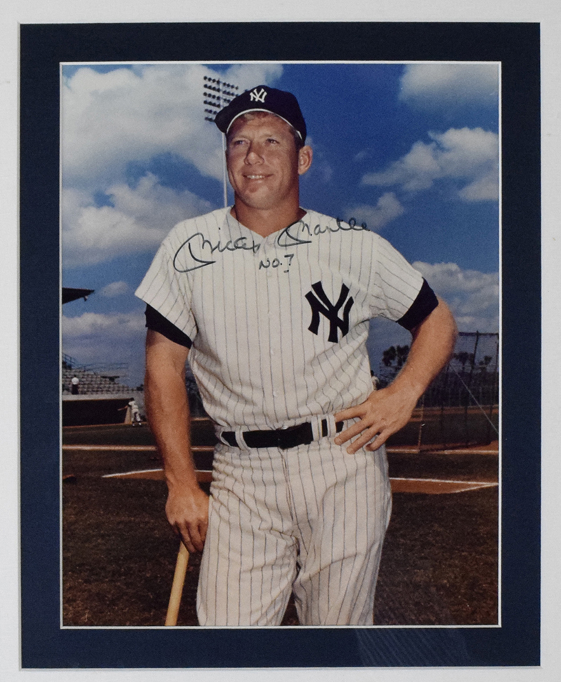 Description:Mickey Mantle signed 11"x14" photograph with "No.7" inscription (NM framed).Frame measures approx. 15.5"x19.5". Mantle signed the photo in blue marker and added "No. 7" inscription. Signature rates 7/8 out of 10. Due to framing, complete condition is unknown: NM appearance