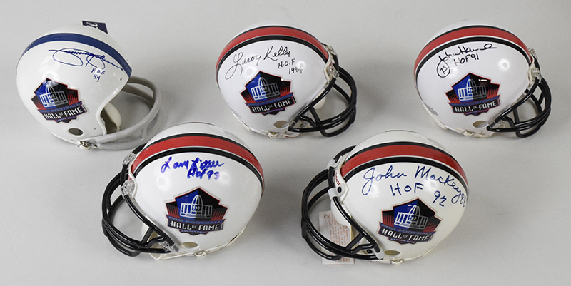 Description:Lot of (5) signed and inscribed Pro Football Hall Of Fame mini helmets (NM overall).Includes John Hannah, John Mackey, Larry Little, Leroy Kelly, and Jimmy Johnson with all adding their HOF inscription. Signatures rate 8 to 9/10 out of 10: NM overall