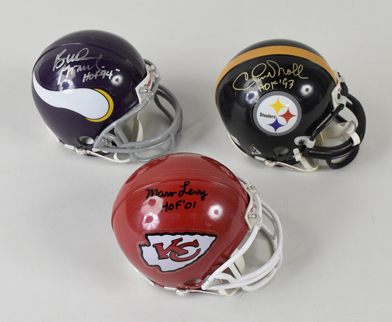 Description:Chuck Noll, Bud Grant, and Marv Levy signed & inscribed mini helmets (NM-NM/MT).Includes a Pittsburgh Steelers mini helmet signed by Chuck Noll with "HOF 93" inscription, Minnesota Vikings mini helmet signed by Bud Grant with "HOF 94" inscription, and Kansas City Chiefs mini helmet signed by Marv Levy with "HOF 01" inscription (JSA). Signatures rate 8/9 to 9/10 out of 10: NM-NM/MT