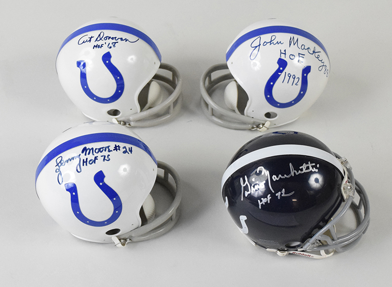 Description:Art Donovan, John Mackey, Gino Marchetti, Lenny Moore signed & inscribed Baltimore Colts mini helmets (NM-NM/MT).All are signed in either blue or silver marker, and each added their HOF induction year inscription. Signatures rate 8 to 9/10 out of 10: NM-NM/MT