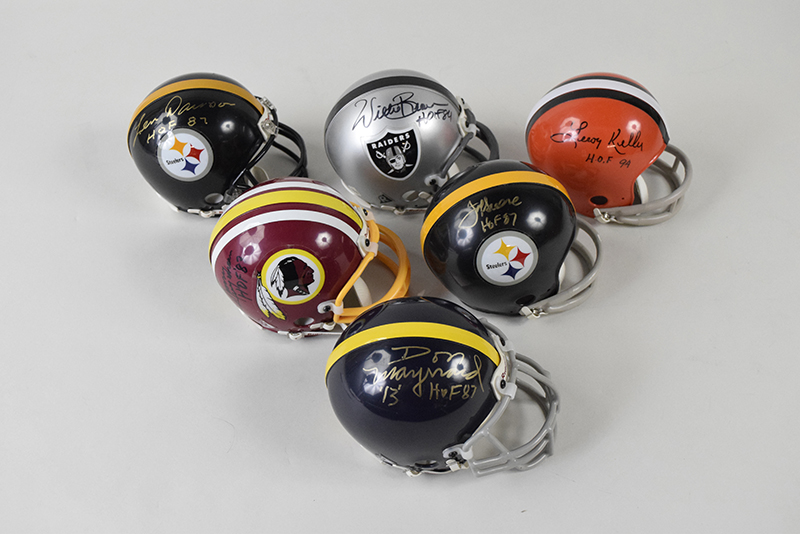 Description:Lot of (6) Football HOFers signed and inscribed mini helmets (NM overall).Includes a Pittsburgh Steelers mini helmet signed by Joe Greene with "HOF 87" inscription, Steelers mini helmet signed by Len Dawson with "HOF 87" inscription, New York Titans mini helmet signed by Don Maynard with "HOF 87" inscription, Cleveland Browns mini helmet signed by Leroy Kelly with "HOF 94" inscription, Washington Redskins mini helmet signed by Sonny Jurgensen with "HOF 83" inscription, and Oakland Raiders mini helmet signed by Willie Brown with "HOF 84" inscription. Signatures rate 7 to 9/10 (avg 8) out of 10: NM overall
