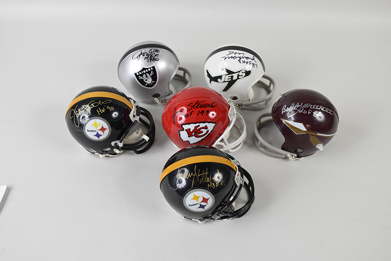 Description:Lot of (6) Football HOFers signed and inscribed mini helmets (NM overall).Includes a Pittsburgh Steelers mini helmet signed by Jack Lambert with "HOF 90" inscription, Steelers mini helmet signed by John Stallworth with "HOF 02" inscription, Oakland Raiders mini helmet signed by jim Otto with "HOF 1980" inscription, Washington Redskins mini helmet signed by Bobby Mitchell with "HOF 83" inscription (minor decal peeling), New York Jets mini helmet signed by Don Maynard with "HOF 87" inscription, and Kansas City Chiefs mini helmet signed by Jan Stenerud with "HOF 1991" inscription. Signatures rate 7 to 9/10 (avg 8) out of 10: NM overall