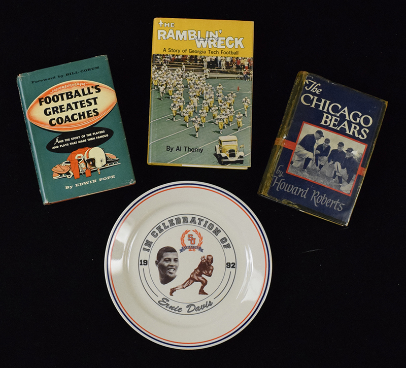 Description:Lot of (3) vintage football books signed by the authors, plus Ernie Davis Celebration plate (VG-NM).Includes 1947 "The Chicago Bears" signed by Howard Roberts (taped edges of dustjacket), 1955 "Football's Greatest Coaches" signed by Edwin Pope (personalized), 1973 "The Ramblin' Wreck" signed by Al Thomy (personalized), and 1992 Syracuse "In Celebration Of Ernie Davis" plate (NM). Range: VG-NM
