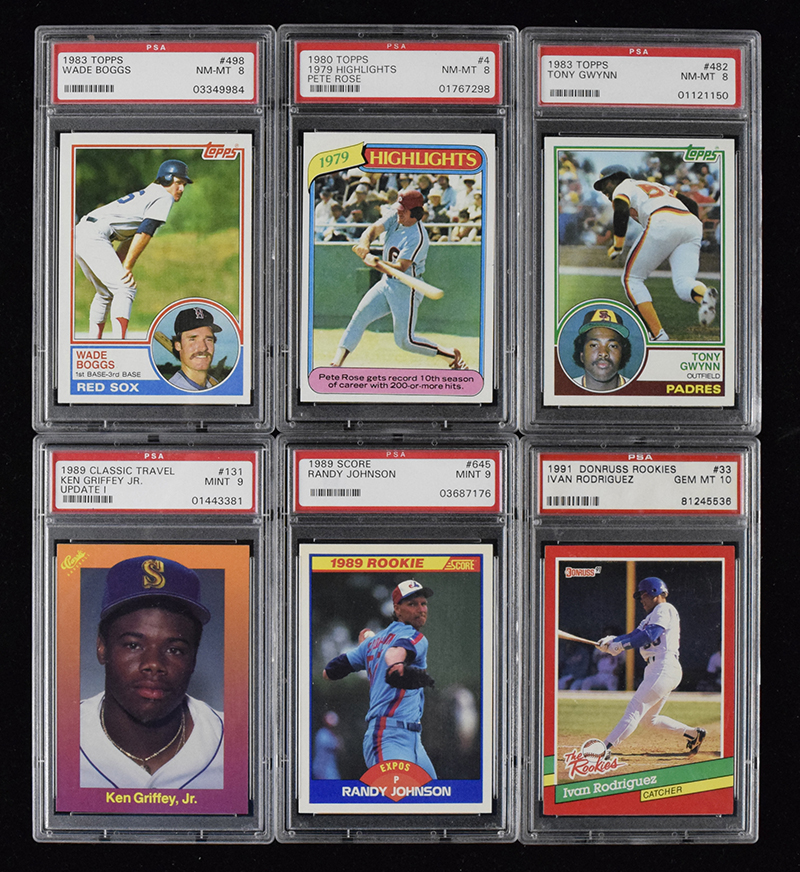 Lot of assorted sports memorabilia, cards, and autographs (NM-NM/MT overall).Includes (66) graded baseball cards from 1972-2004 with highlights including 1972 Topps #s 28 Twins Rookies (PSA 7 NM), 588 Holt (PSA 7 NM); (2) 1980 Topps #4 Pete Rose (both PSA 8 NM/MT); (2) 1983 Topps #482 Tony Gwynn rookies (both PSA 8 NM/MT); (2) 1983 Topps #498 Wade Boggs rookies (both PSA 8 NM/MT); (3) 1989 Classic Travel #131 Ken Griffey Jr rookies (PSA 9 MT and two PSA 8 NM/MT); 1989 Donruss #33 Griffey rookie (PSA 7 NM); (2) 1989 Donruss Baseball's Best #324 Sammy Sosa rookies (both PSA 9 MT); 1989 Score #645 Randy Johnson rookie (PSA 9 MT); (2) 1991 Donruss Rookies #33 Ivan Rodriguez rookies (both PSA 10 GEM MINT); 1991 Upper Deck Final Edition #87F Griffey (PSA 10 GEM MINT); 1997 Donruss "Rated Rookies" #27 Vladimir Guerrero (PSA 9 MT); 1999 Topps Finest #294 Sabathia rookie (PSA 9 MT); 1999 Bowman's Best #171 Sabathia rookie (PSA 9 MT); and others. Also includes some sets, partial sets, and singles, B.Selig ML ball (light toning) signed by Herb Score rating 5/6 out of 10, framed 8"x10" photo signed by Pat Burrell rating 9/10 out of 10 (MLB Authenticated), and other cards including stars and HOFers: NM-NM/MT overall
