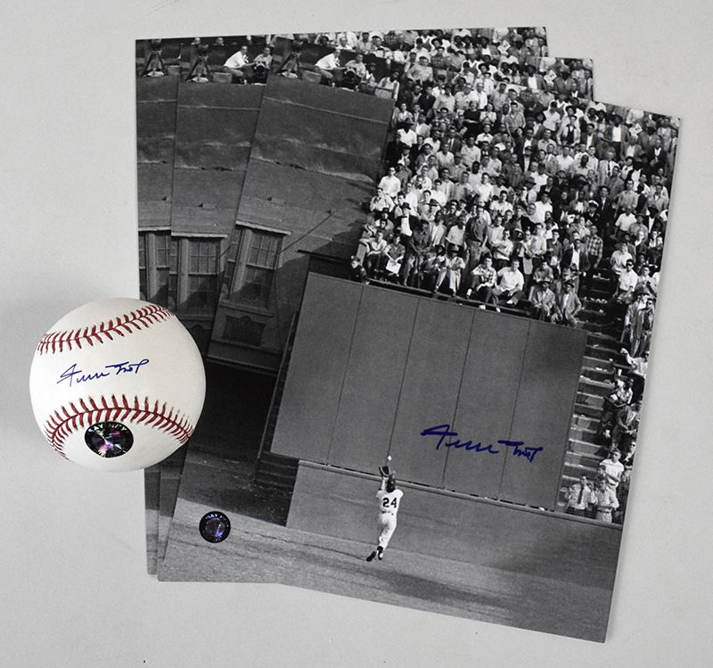 Description:Willie Mays signed baseball and (3) signed 8"x10" photographs (NM-NM/MT).Includes B.Selig ML ball signed by Mays in blue ink, and (3) 8"x10" photos all signed by Mays in blue marker. Signatures rate 8/9 to 10 out of 10. Say Hey Authenticated hologram sticker is affixed to each: NM-NM/MT