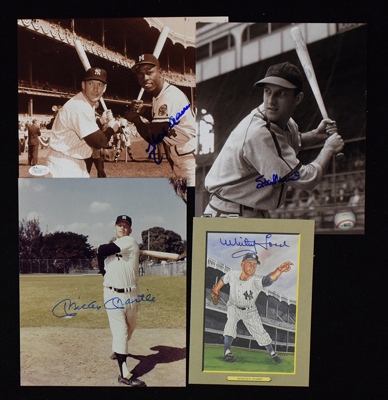Description:Stan Musial, Mickey Mantle, Hank Aaron, Whitey Ford autograph lot (NM-NM/MT).Includes 8"x10" photos signed by Stan Musial, Mickey Mantle, and Hank Aaron (JSA); and 1985 Perez-Steele Great Moments card signed by Whitey Ford. Signatures rate 6/7 (Hank Aaron smudge) to 10 (avg 8/9) out of 10: NM-NM/MT