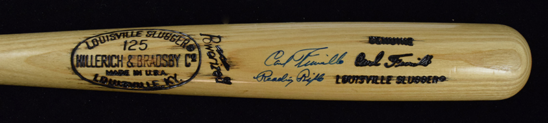 Description:Carl Furillo signed and inscribed "Reading Rifle" replica model baseball bat (NM).35" Louisville Slugger U1 Carl Furillo replica model bat signed by Furillo in blue marker with "Reading Rifle" inscription. Signature rates 8/9 out of 10: NM