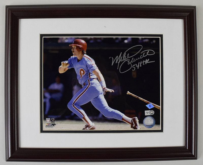 Description:Mike Schmidt signed and inscribed framed photograph - MLB Authenticated (NM).Frame measures approx. 13"x16". Schmidt signed the photo in silver marker and added "548 HR" inscription. Signature rates 9 out of 10. MLB Authenticated serial #ed hologram sticker is affixed. Due to framing, complete condition is unknown: NM appearance