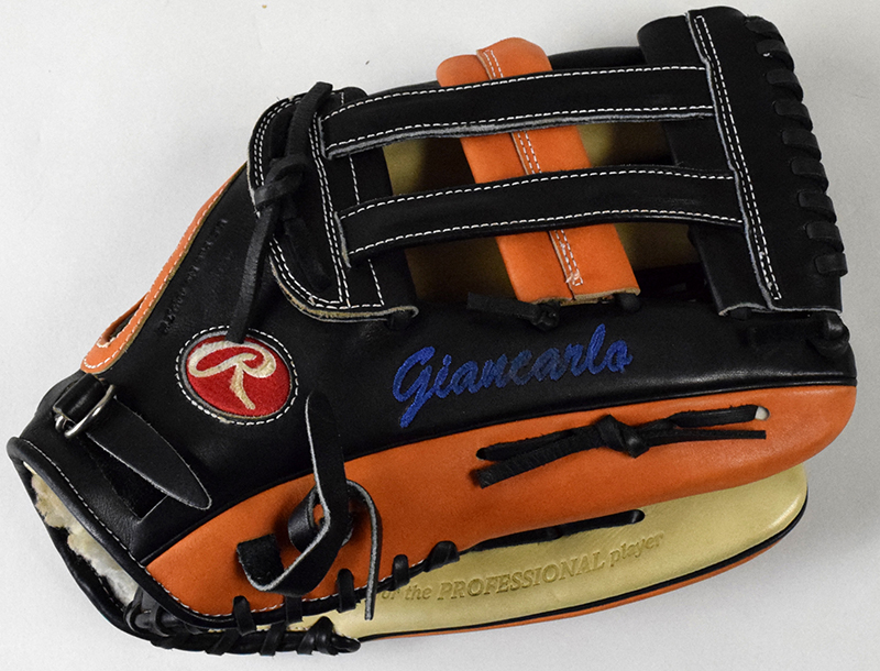Description:2015 Giancarlo Stanton professional model glove (PSA/DNA - Taube full letter) (EX)Rawlings model "PRO S27 HFB" outfielder's glove with dual post "H" style web is done in three tones of leather with "Giancarlo" player name embroidered on the outside. Includes a full LOA from PSA/DNA confirming that it a professional model displaying evidence of moderate use. A rarely offered and desirable piece of equipment from one the premier players in the game today: EX ($1,000-$2,000)