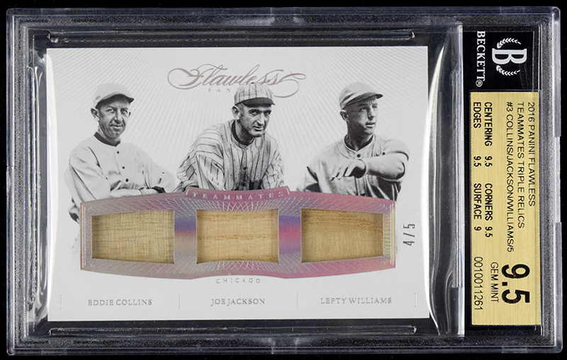 Description:2016 Panini Flawless "Teammates" Joe Jackson, Eddie Collins, and Lefty Williams triple relic card ("4/5") (Beckett 9.5 Gem Mint)Rare insert is numbered "4/5" and has been graded "9.5 Gem Mint" by Beckett: Beckett 9.5 Gem Mint ($300-$500)