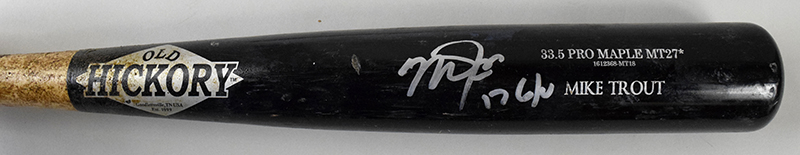 Description:2017 Mike Trout autographed and "G/U" inscribed professional model baseball bat (PSA/DNA "GU 10") (EX)Old Hickory brand "MT27*" model bat measures 33.5" long and weighs 32.6oz. Uncracked with heavy use throughout including ball, stitch, and cleat marks. Signed in silver marker rating 9/10 out of 10 and inscribed "17 G/U." Includes full LOA from PSA/DNA with "GU 10" grade and additional letter from Anderson Authentics: EX ($3,000-$5,000)