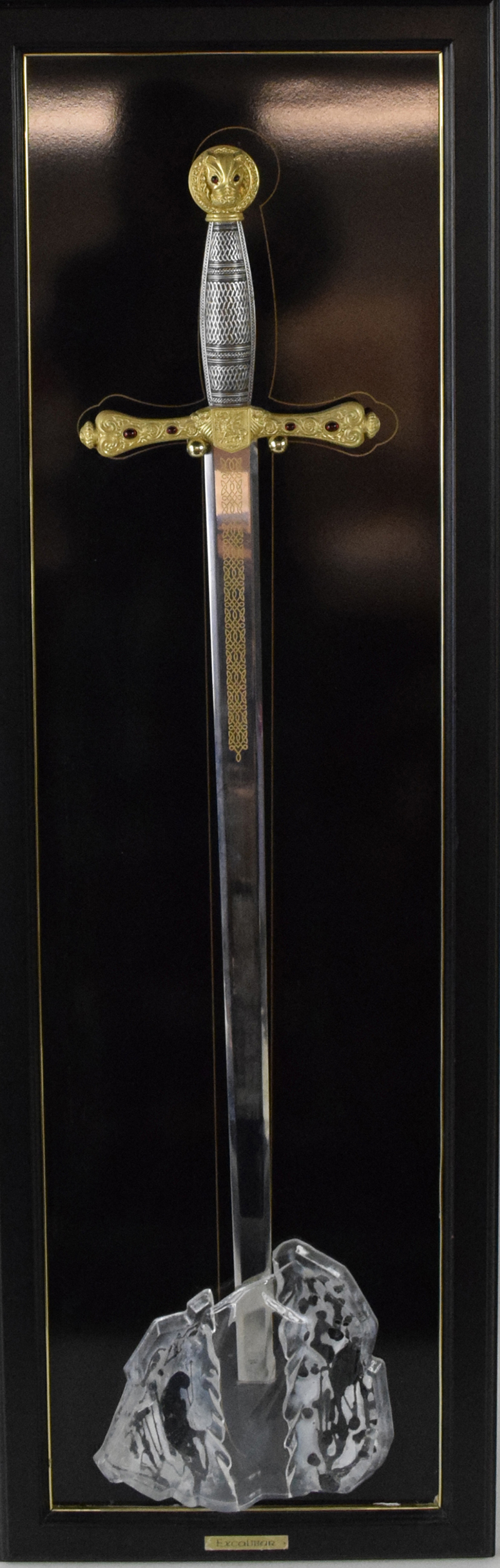Description:Excalibur sword by Franklin Mint (NM). Approx. 44" long sword which can be removed from its 16.5"x51" wooden wall mount. The mount has a stone-like formation at the bottom, which the sword sits in: NM overall