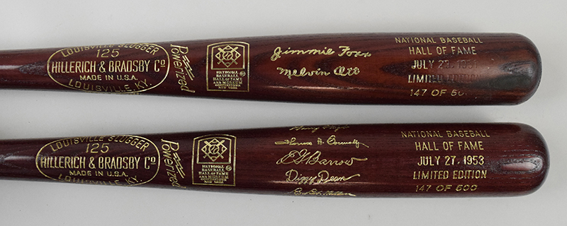 Description:1951, 1953, and 1954 Baseball HOF Induction limited edition baseball bats (EX-NM/MT). Includes 1951 bat commemorating the inductions of Jimmie Foxx and Mel Ott (#ed 147/500, wear near the end of the bat); 1953 bat commemorating the inductions of Chief Bender, Al Simmons, Bobby Wallace, Dizzy Dean, Harry Wright, Ed Barrow, Tom Connolly, and Bill Klem (#ed 147/500); and 1954 bat commemorating the inductions of Bill Terry, Bill Dickey, and Rabbit Maranville (#ed 147/500): EX-NM/MT