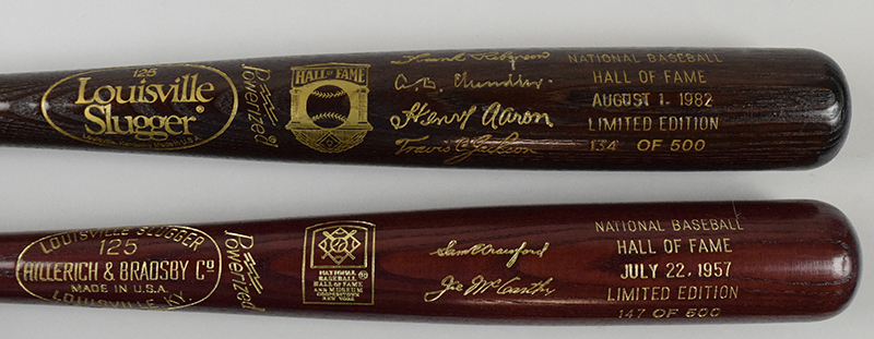 Description:1957, 1964, and 1982 Baseball HOF Induction limited edition baseball bats (NM-NM/MT). Includes 1957 bat commemorating the inductions of Sam Crawford and Joe McCarthy (#ed 147/500); 1964 bat commemorating the inductions of John Ward, Tim Keefe, Burleigh Grimes, Heinie Manush, Miller Huggins, Luke Appling, and Red Faber (#ed 147/500); 1982 bat commemorating the inductions of Travis Jackson, Frank Robinson, Hank Aaron, and Happy Chandler (#ed 134/500): NM-NM/MT