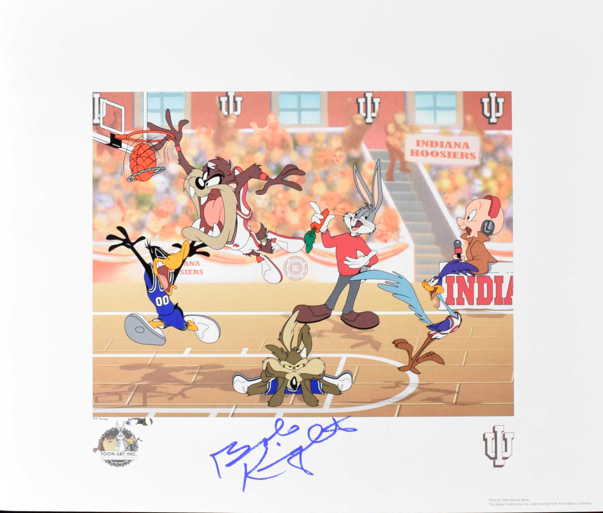 Description:"Slam Dunk" - Bobby Knight signed limited edition Warner Brothers print (NM) A limited edition "Looney Tunes" and college basketball-themed lithoserigraph, signed by former Indiana Hoosiers coach Bob Knight. This print depicts "Looney Tunes" characters as players for the "Indiana Hoosiers", with Bugs Bunny standing in as coach. This print is marked as an artist's proof and is numbered to its lower left corner, and includes a printed seal and certificate of authenticity from Toon Art Inc. It is presented unframed along with a photo of the coach signing a copy of the print. 19"x23.75": NM