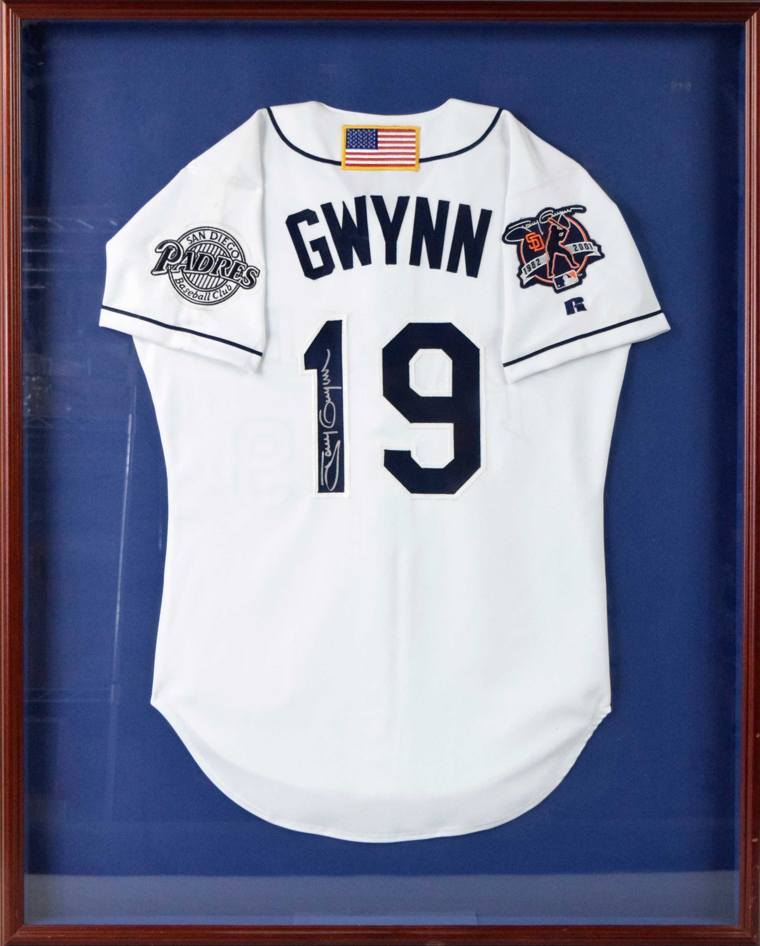 Description:Tony Gwynn autographed San Diego Padres jersey with Gwynn patch (NM) High quality jersey has been signed on the back number in silver marker rating 9/10 out of 10. Framed in a large shadowbox to 33.75"x42" for display: NM
