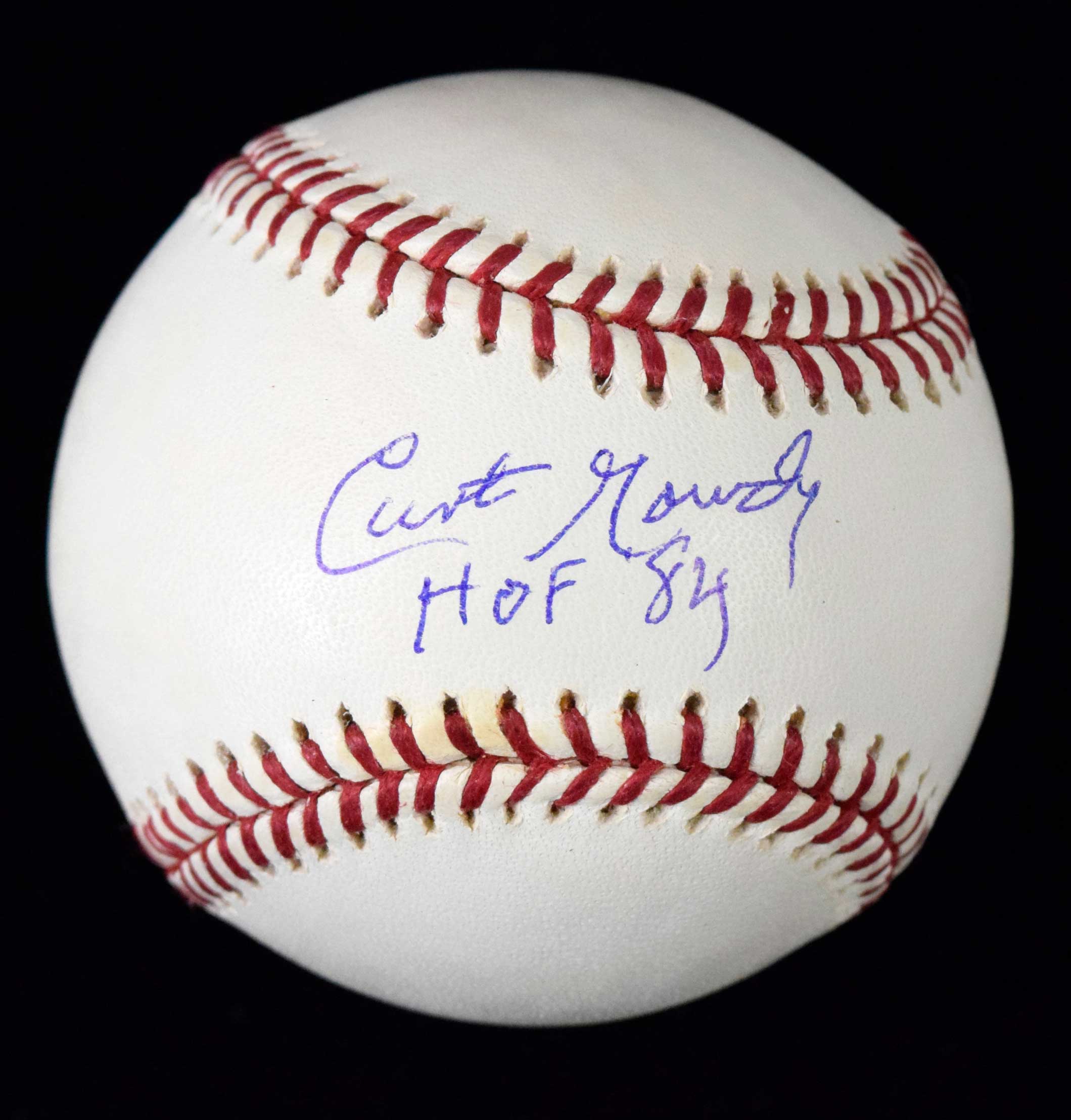 Description:Curt Gowdy single signed baseball with "HOF 84" inscription (NM) Rawlings B.Selig OML ball has been signed in ink rating 8/9 out of 10. There is one small spot of toning not visible when positioned for display: NM