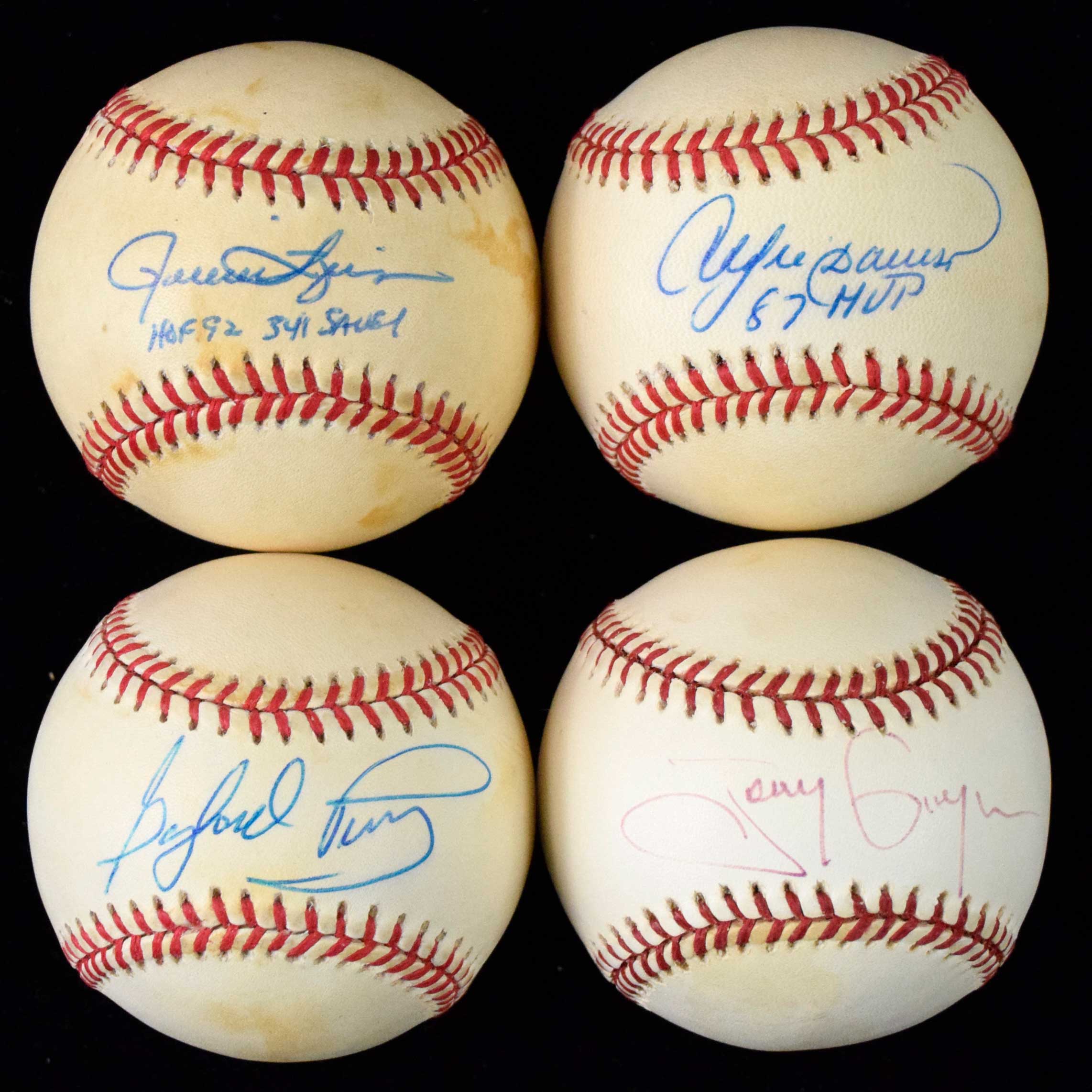 Description:Lot of (6) Hall of Famer single signed baseballs incl. Gwynn (EX-NM) Rawlings Official American, National, or Major League baseballs with signers incl. Tony Gwynn (slightly faded, very light toning), Carl Yastrzemski with HOF (lightly toned, some feathering to signature), Andre Dawson with MVP inscription (lightly toned), Rollie Fingers with HOF and Save total inscriptions (mild toning), Gaylord Perry (lightly toned), and Dave Winfield (side panel). Sigantures rate 7 to 8 out of 10: EX-NM