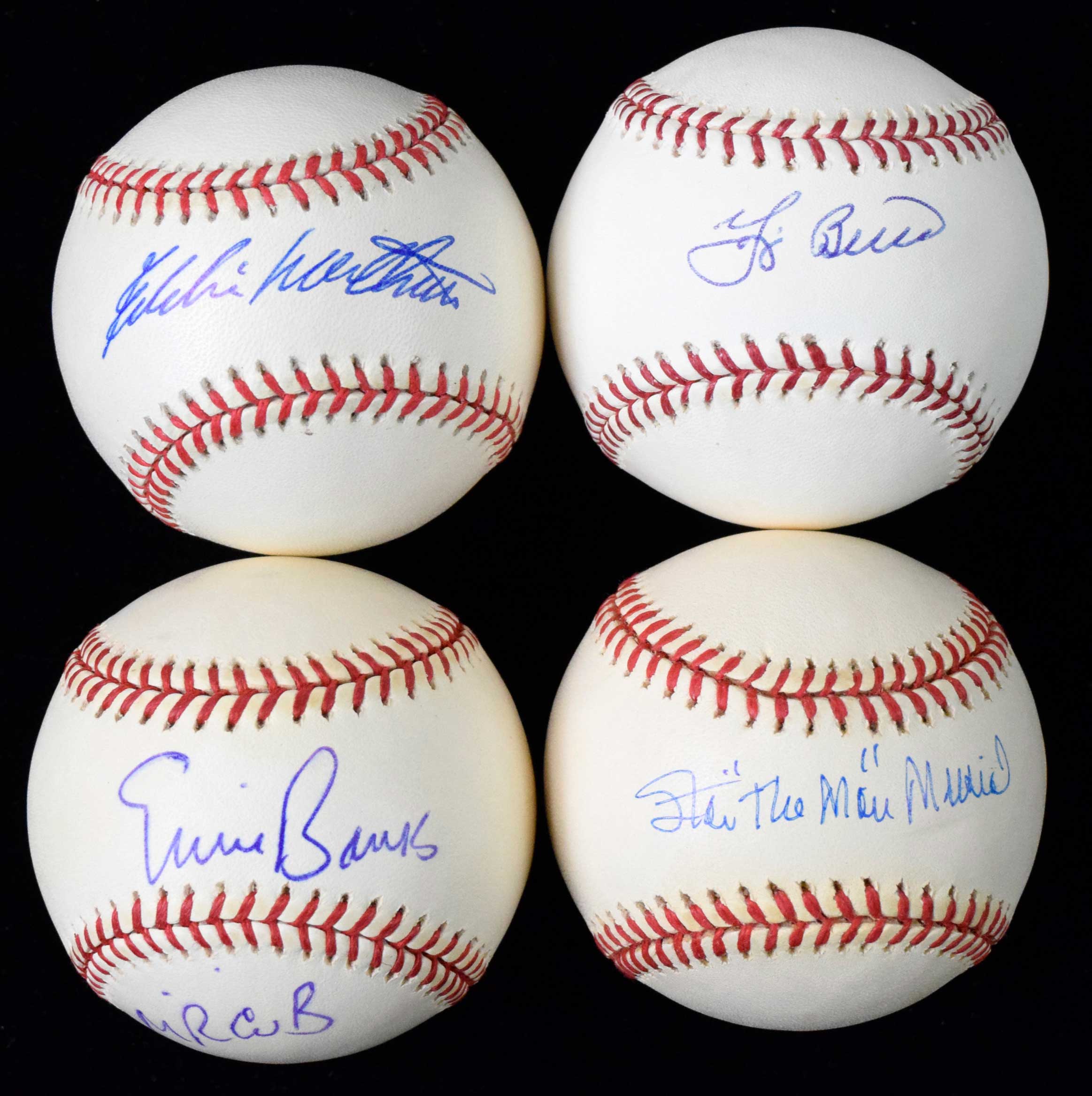 Description:Stan Musial, Ernie Banks, Yogi Berra, and Eddie Mathews single signed baseballs (EX/MT) Rawlings L.Coleman ONL balls signed by Musial ("Stan The Man Musial", small surface impression below signature) and Eddie Mathews; B.Selig OML ball signed by Berra; G.Budig OAL ball signed by Banks. Signatures rate 7 (Banks) to 8 out of 10. Hint of extremely minor scattered toning: EX/MT