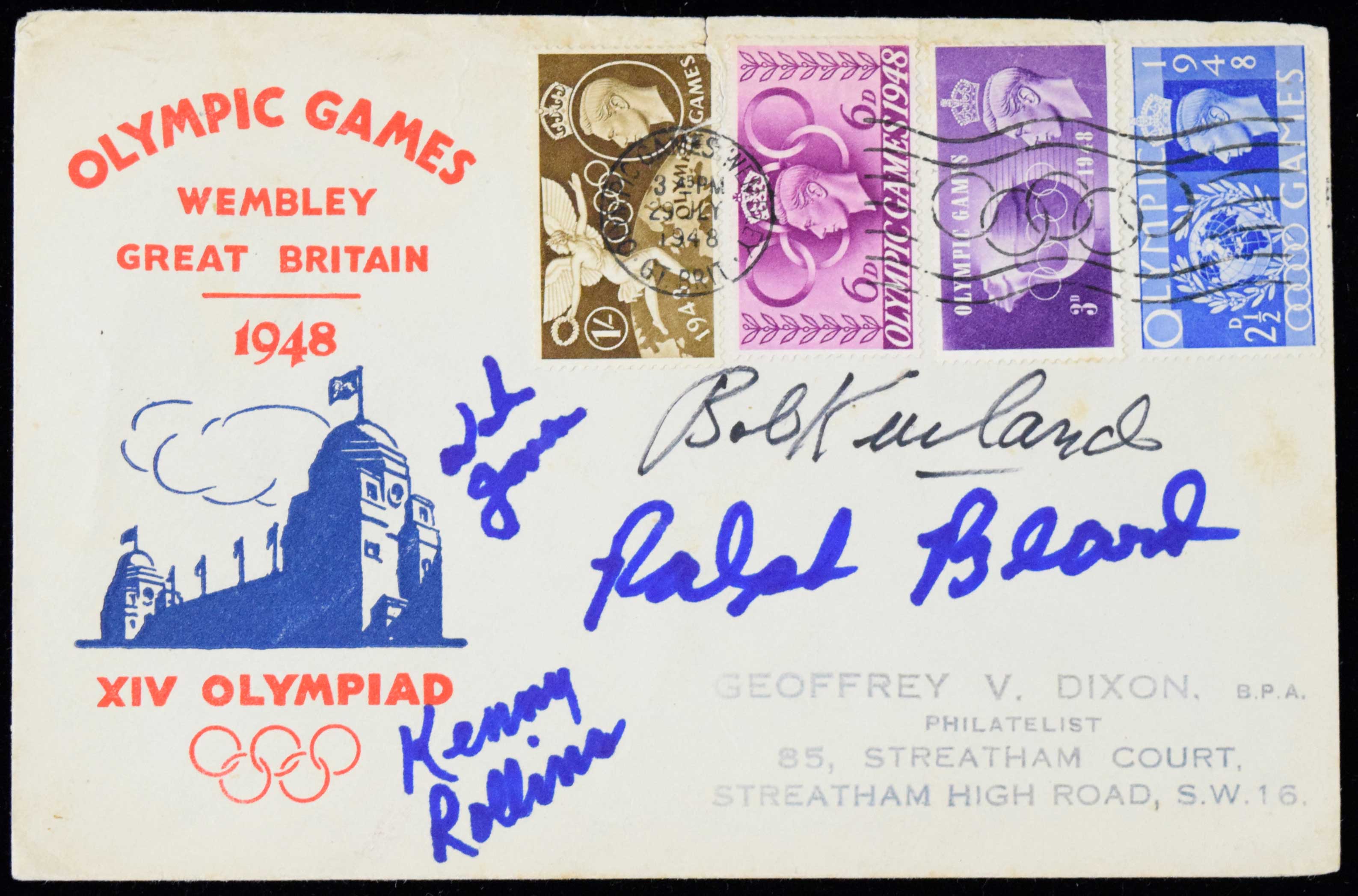 Description:1948 Olympics postal cover with (4) basketball Gold Medalist autographs (3 Kentucky HOFers) (Cover EX, Sigs. NM) Original 1948 Olympic related postal cover (light toning and light/mild wear) has been signed in marker (8 to 9/10 out of 10) by Bob Kurland, Ralph Beard, Kenny Rollins, and Wallace Jones. Includes COA from JSA: Sigs. NM, Cover EX