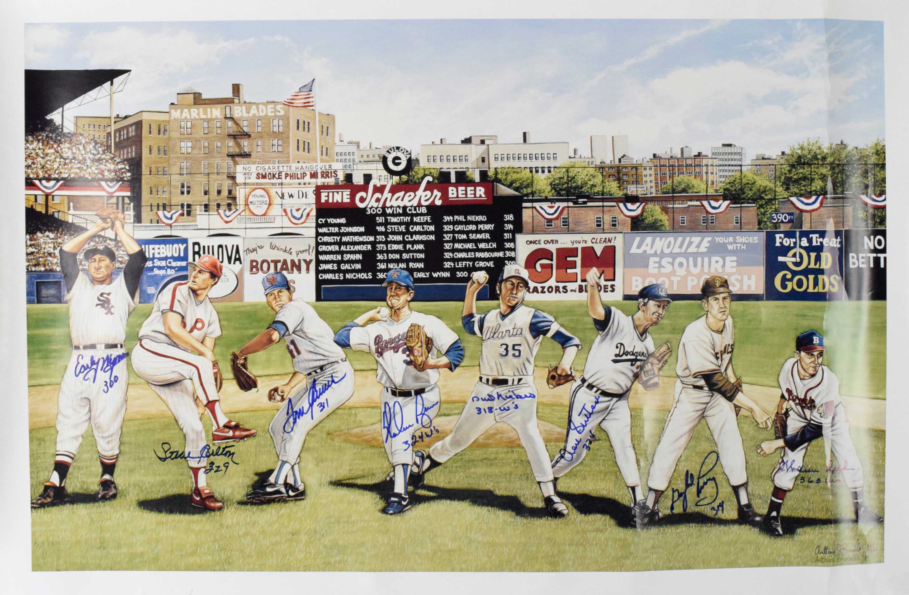 Description:300 Win Club multi-signed & inscribed limited edition lithograph also signed by artist Anthony Brunelli (Sigs. NM, Print has creases) Approx. 21"x33" lithograph signed by Warren Spahn, Gaylord Perry, Don Sutton, Phil Niekro, Nolan Ryan, Tom Seaver, Steve Carlton, and Early Wynn with all adding their win total inscription. Signatures rate 8/9 to 10 out of 10. Also signed by Anthony Brunelli, and #ed 232/1994. Rolled for storage and there is some wear/creasing: Sigs. NM, Print has creases