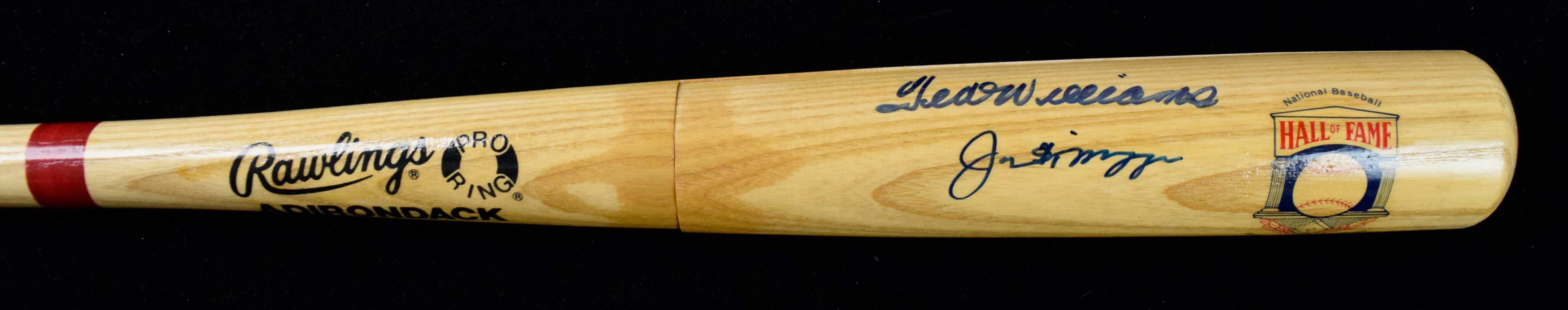 Description:Joe DiMaggio and Ted Williams autographed baseball bat (see description) Blue marker "Ted Williams" and "Joe DiMaggio" autographs rating 8/9 out of 10 appear on the barrel of a "Hall of Fame" logo baseball bat. For unknown reasons, the signed portion as at one time cut off of the bat and later reaffixed in place (now sitting very slightly askew). Please see our image (or ask for additional) to see what effect this has on display value: see description