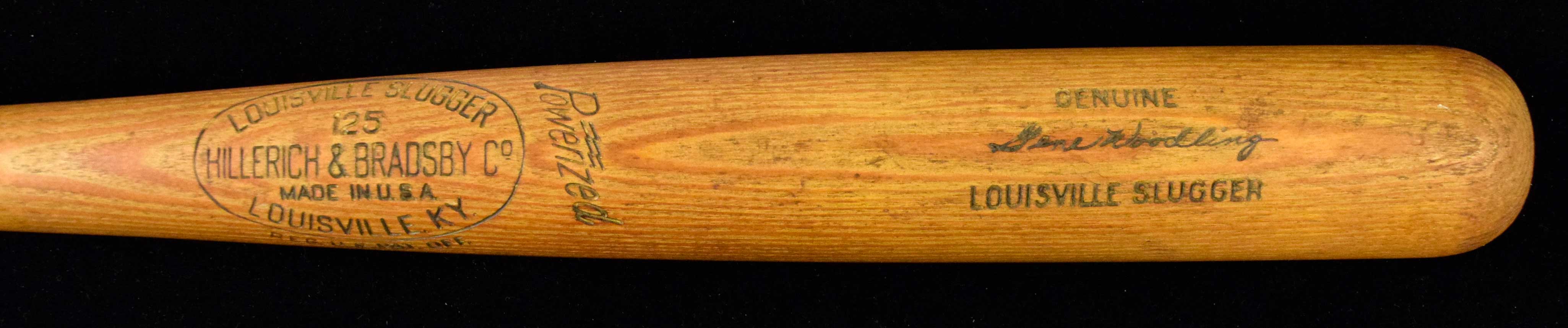 Description:Gene Woodling professional model baseball bat c.1950s (EX) Louisville Slugger 125 model bat with Wooling facsimile signature in the barrel measures 35" and has model number "M110" stamped in the knob. Mild use and some general surface wear (including divots on the back of the barrel) along with an upper handle crack: EX
