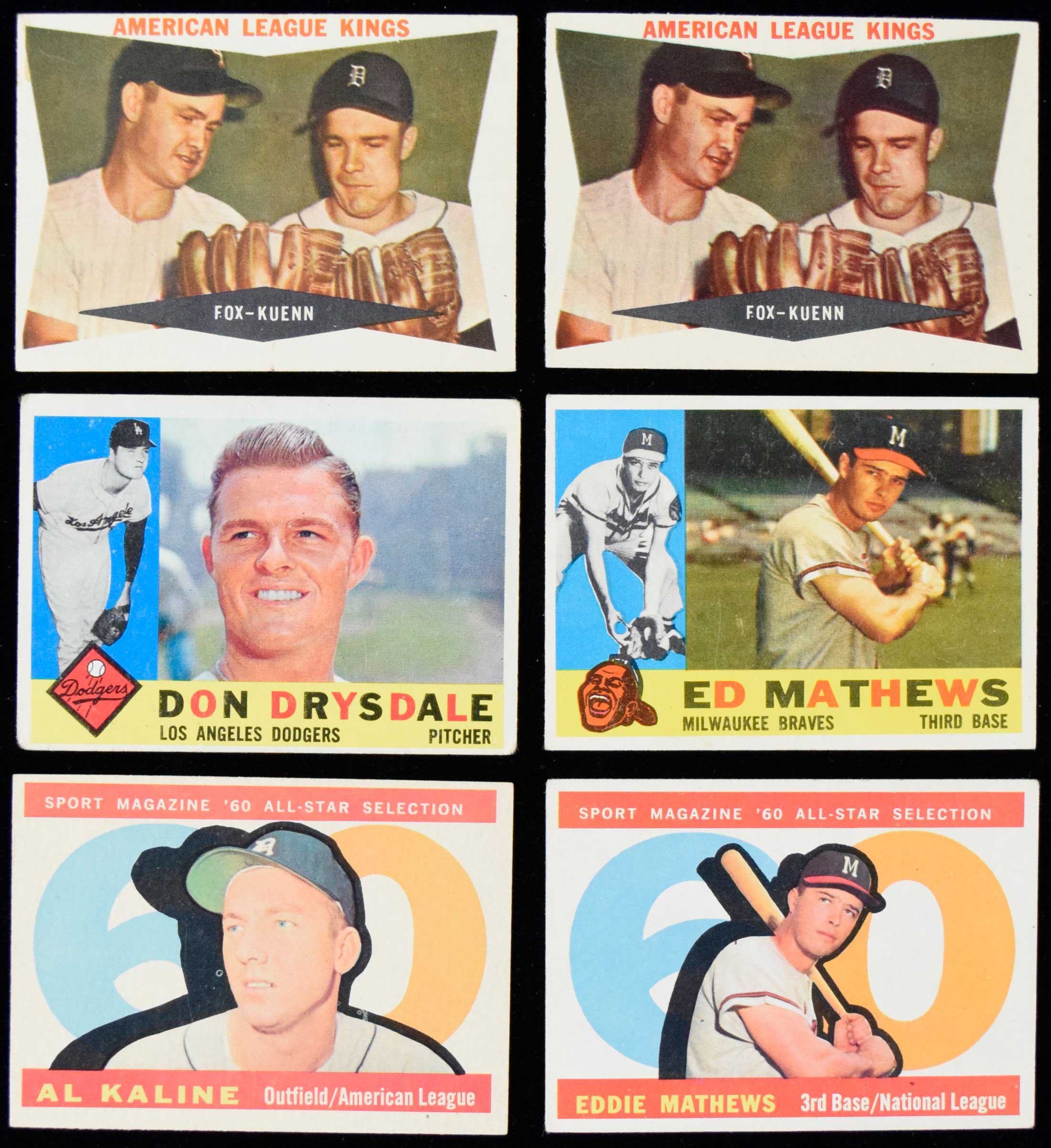 Description:Lot of approx. (210) 1960 Topps Baseball cards incl. stars (Avg. VG/EX) Cards range from number (296) to (561) with varying degrees of duplication (not all cards in that number run are represented and there are very few higher numbers). Average VG/EX condition with GD-EX general range. Includes Don Drysdale, (2) Fox/Kuenn, Eddie Mathews, Carl Furillo, (4) Hoyt Wilhelm, (7) Moose Skowron, (2) Minnie Minoso, Don Larsen, Don Newcombe, and (9) Bob Allison. ALso includes Sport Magazine All Stars Frank Malzone, Eddie Mathews, and Al Kaline (Kaline FR): Avg. VG/EX