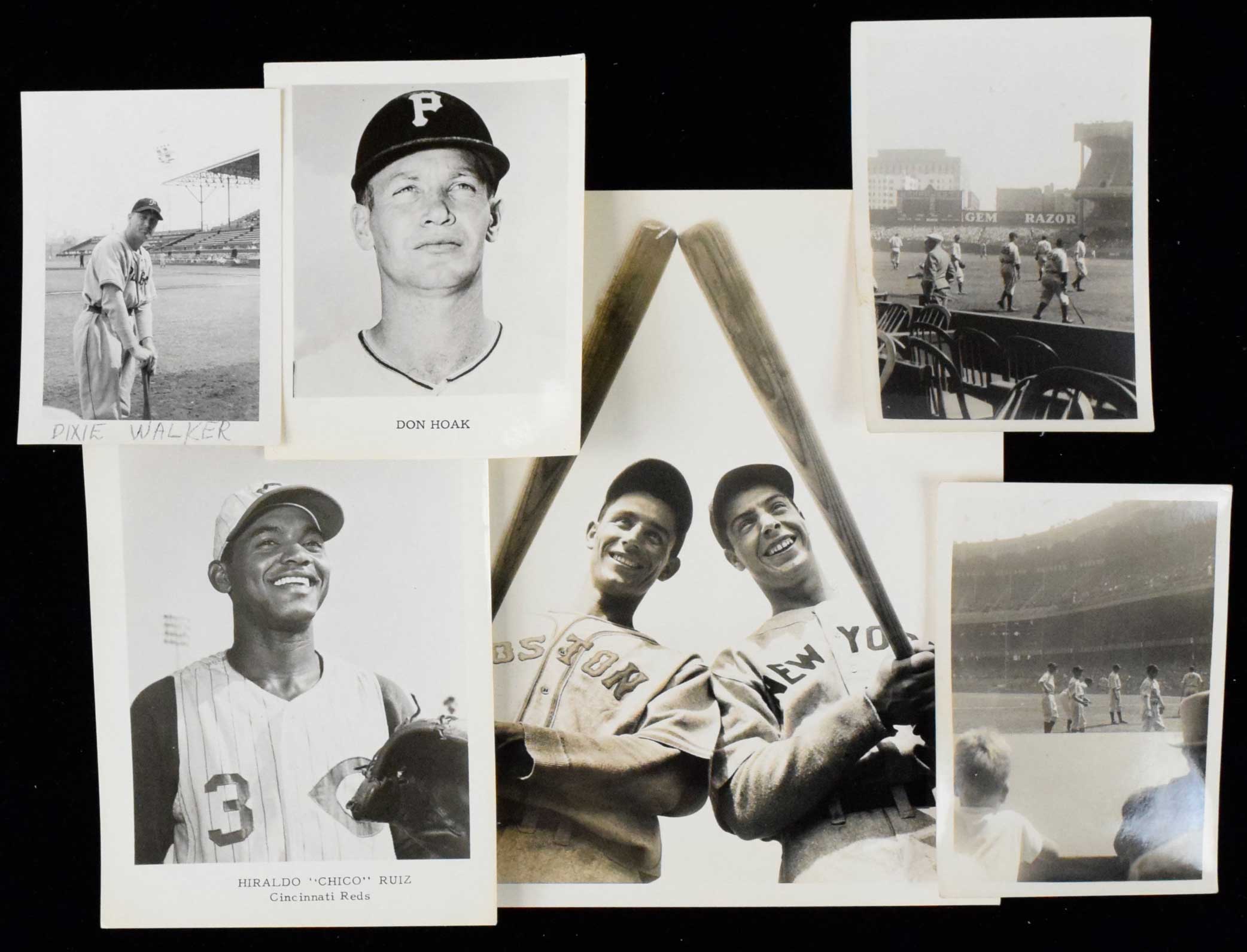 Description:Lot of approx. (70) vintage baseball players photos/imagesc.1930s-70s (VG-EX/MT) Includes late 1930s press photo of Joe and Vince DiMaggio; several c.1950s baseball player snapshots incl. Terry Moore, Dixie Walker, and (3) of players in Yankee Stadium; a good number of vintage team issued, photo pack, and other/similar type pieces with subjects incl. Jim Brosnan, Jim Bouton, Hank Bauer, Bill Bruton, and Bill Hitchcock. Varying degrees/types of wear throughout: VG-EX/MT