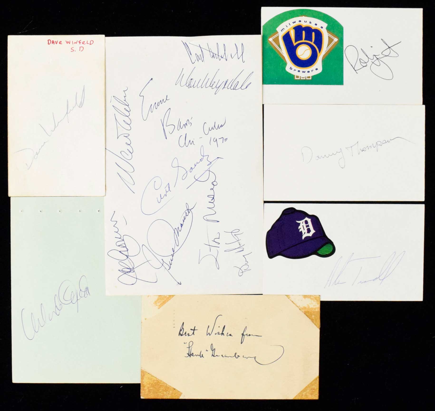 Description:Lot of (300+) Baseball player autographs incl. Hall of Famers (EX-NM) Nearly all appear on index cards with a small portion on multi-signed album pages or sheets of paper. Includes Hank Greenberg vintage signed Government postcard; sheet of paper signed by (9) incl. Don Drysdale, Danny Murtaugh, Curt Gowdy, Ernie Banks, Walt Alston, Joe Cronin, and Carl Hubbell; sheet of notebook paper signed by (11) former baseball players incl. Dallas Green, Pnuts Lowrey, and Art Mahaffey; small slip of paper with several autographs incl. Richie Ashburn; Bob Feller cut; signatures appearing on multi-signed album pages include Red Schoendienst, Orlanda Cepeda, Phil Niekro, and Chris Short; and index cards incl. Robin Yount, Kent Tekulve, Danny Thompson, Alan Trammell, Mickey Vernon, Bob Uecker, Fernando Valenzuela, Dave Winfield, and Dick Williams. Signatures rate 6/7 to 9 out of 10. Light to moderate scattered wear: EX-NM