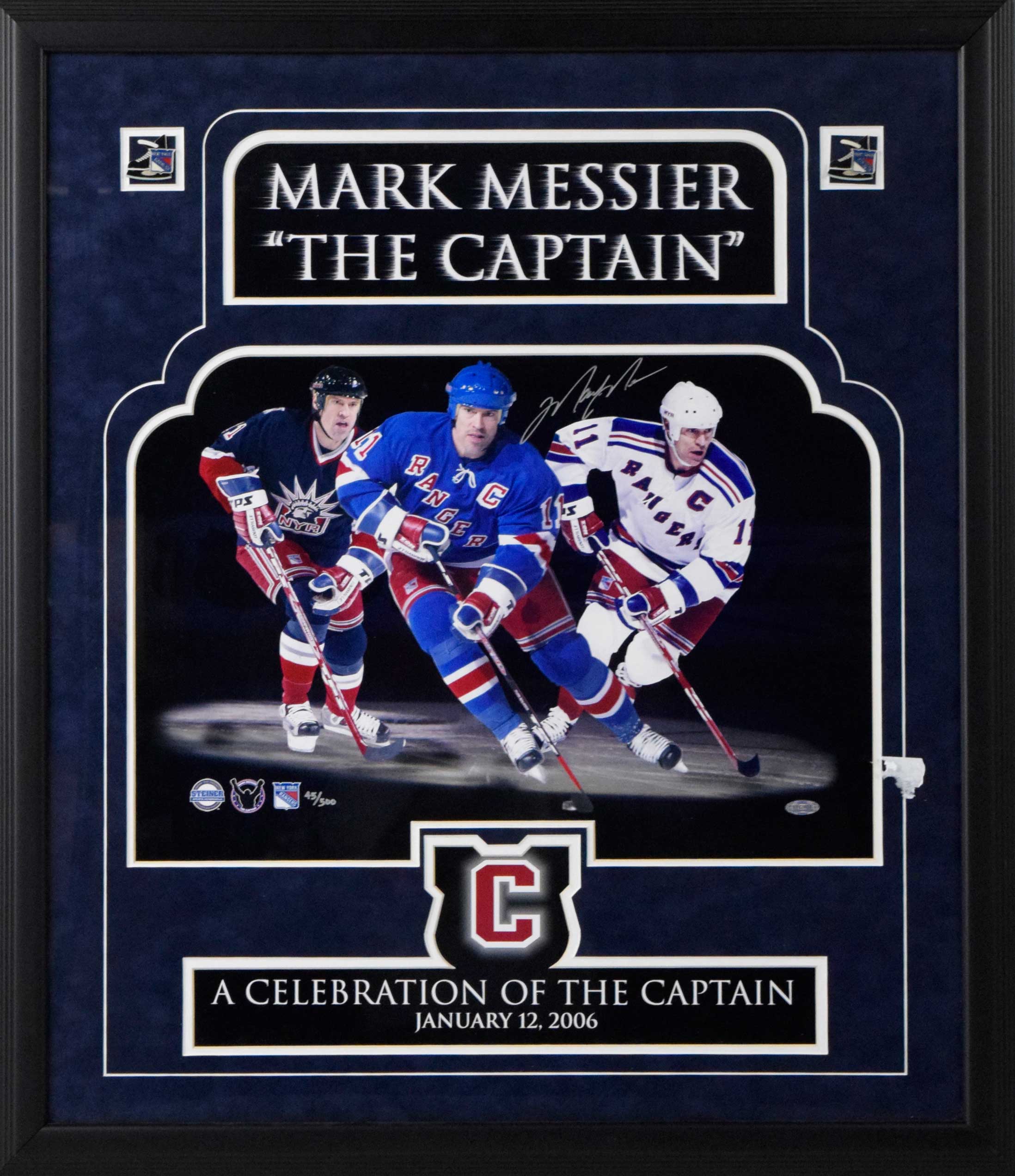 Description:Mark Messier signed limited edition "The Captain" photograph/display (Steiner) (NM) Color photo has been signed in marker rating 9/10 out of 10, numbered out of (500), and framed to 26.5"x30.5" for display (there is a small spot of residue no front which could likely be cleaned off). Includes COA from Steiner: NM