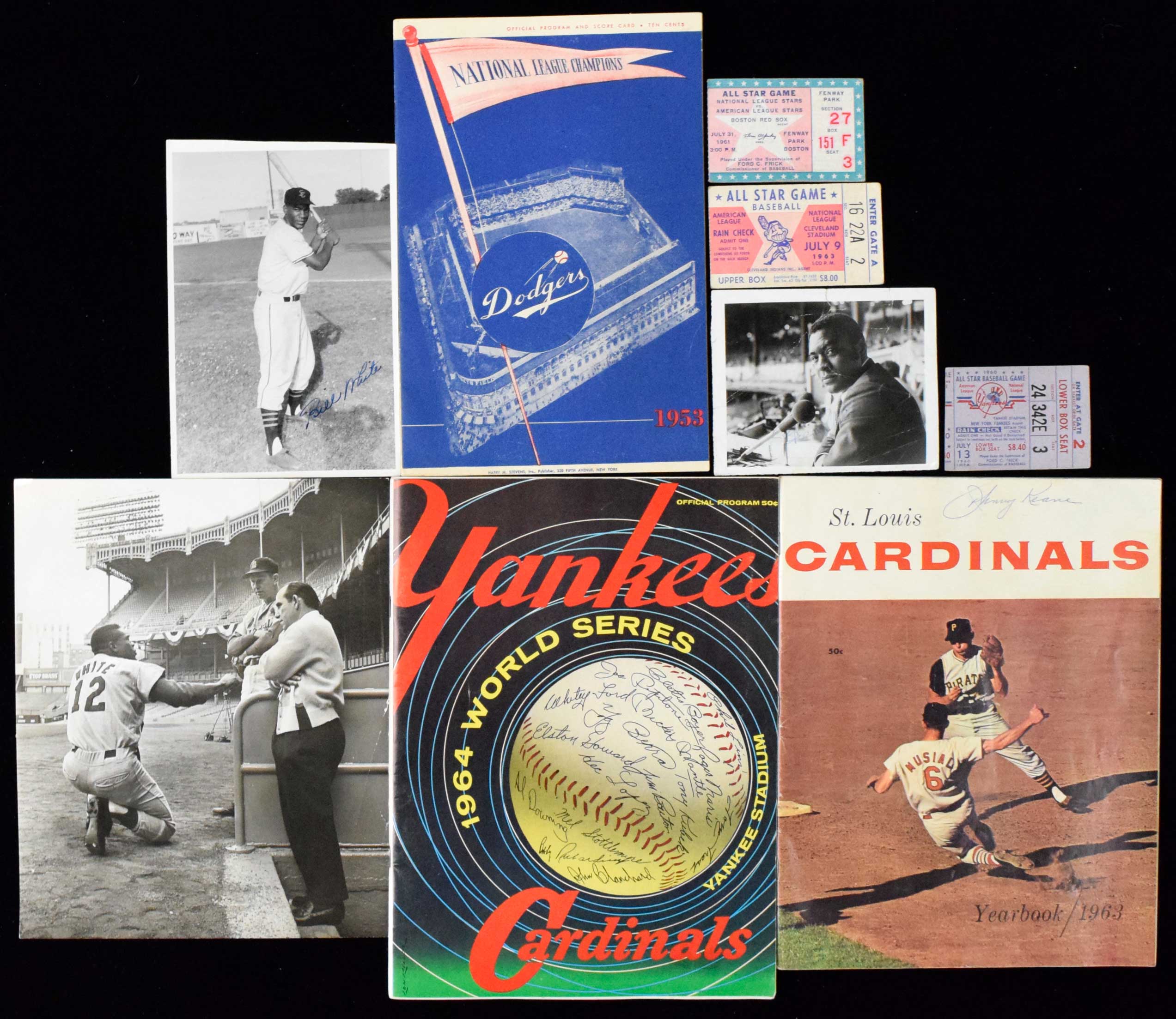 Description:Nice lot of vintage pieces from the Bill White Collection (GD-EX/MT) Includes 1960, 61, and 63 All Star Game ticket stubs; 1964 World Series program; 1963 Cardinals yearbook signed on the cover by Johnny Keane; 1953 Dodgers vs. Giants scorecard; (2) 1952 Indians scorecards; 1956 Pirates vs. Giants scorecard and a July 29, 1956 Giants ticket stub (Mays homerun game); 1954 Sioux City soos yearbook; (2) vintage Bill White signed small photos; 1964 Cardinals World Champs mini pennant; Billy Martin funeral invitation; large group of Bill White related photography (approx. 50 pieces) with some from his earlier playing days and the bulk stretching to later in his career and after. He is shown in uniform in a portion and street clothes in the balance; and piece of approx. 11"x14" original artwork of White. Varying degrees/types of wear throughout: GD-EX/MT